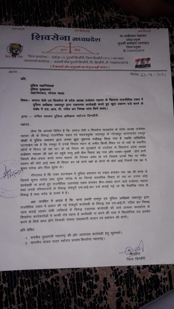 डिंडोरी। समाजसेवी व शिवसेना मध्यप्रदेश के प्रदेशाध्यक्ष ठाडेश्वर महावर के विरुद्ध जबलपुर के गोरखपुर थाना अंतर्गत रामपुर चौकी में पुलिस प्रशासन द्वारा मामला कायम किया गया हैं, जोकि राजनीतिक दुर्भावनापूर्ण दर्ज किया गया है, शिवसैनिक ने आरोप लगाया है कि यह कार्यवाही एकतरफा एवं राजनैतिक दबाव एवं षडयंत्र पूर्वक की गई है और उन पर झूठा मुकदमा पंजीबद्ध किया गया है जबकि वास्तविक घटनाक्रम यह है कि रामपुर में उनके निवास स्थान के समीप किसी विषय पर दो पक्षों कि स्थानीय लोगों में विवाद हो रहा था, वह हो रहे विवाद को सुलझाने के उद्देश्य शिवसेना प्रदेश अध्यक्ष ठाड़ेश्वर महावर जी वहां पर पहुंचे, परंतु इसी बीच विवाद बढ़ गया और धक्का-मुक्की होने लगी जिसमें बीच बचाव करते हुए महावर जी गिरकर अचेत हो गए जिससे उनके सिर पर गंभीर रुप से चोटें आई साथ ही विवाद कर रहे दोनों पक्षों के लोगों को भी चोट है जिसमें एक पक्ष शुभम पारेख और पिता सुरेश थे। गौरतलब है कि उक्त घटनाक्रम में पुलिस प्रशासन पर दबाव बनाकर एक पक्ष की तरफ से जिसमें शुभम पारेख तथा सुरेश पारेख जिनसे वास्तविक विवाद हो रहा था उन पर कोई कार्यवाही ना करते हुए राजनैतिक जलन व दबाव बनाकर बीच-बचाव करने वाले थाडेश्वर महावर तथा उनके परिजनों के विरुद्ध दोषपूर्ण FIR दर्ज कराई गई जो कि नैसर्गिक न्याय के विरुद्ध है तथा संदेह के दायरे में है आता है। शिवसैनिक ने जनहित में आग्रह किया है कि थाना प्रभारी रामपुर एवं पुलिस अधीक्षक जबलपुर द्वारा राजनीतिक दबाव में आकर की गई दोषपूर्ण कार्रवाई के विरुद्ध एक एसआईटी गठित कर निष्पक्ष जांच कराई जाए तथा दोषी व्यक्तियों के विरुद्ध दोषी व्यक्तियों के विरुद्ध दंडात्मक कार्यवाही की जावे । अन्यथा इस एकतरफा कार्यवाही को लेकर मध्य प्रदेश शिवसैनिकों में काफी रोष व्याप्त है कार्यवाही ना करने की दशा में शिवसैनिक उग्र प्रदर्शन करने के लिए बाध्य होंगे ,जिसकी समस्त जवाबदारी शासन प्रशासन की होगी। मामले की एसआईटी से उच्च स्तरीय जाँच कराने की मांग को लेकर शिव सेना जिला इकाई डिंडोरी के अध्यक्ष मुरली मनोहर पाराशर के द्वारा एसडीओपी को ज्ञापन सौंपा गया है।