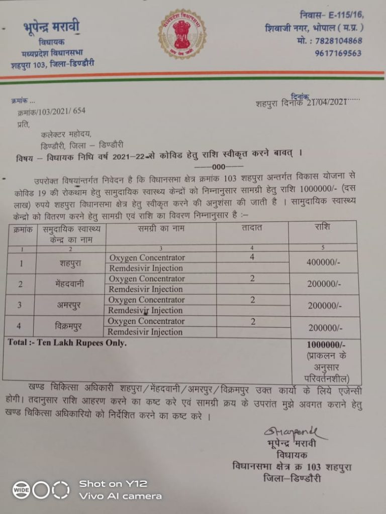 इनका कहना है– कोरोना सक्रमण की दूसरी लहर पहले से ज्यादा खतरनाक है विधानसभा क्षेत्र अन्तगर्त सामुदायिक स्वास्थय केन्दो मे कोरोना सक्रमण के मरीजो को बेहतर उपचार मिल सके इस हेतु विधायक निधि से दस लाख रू की राषि जारी करने कलेक्टर को पत्र लिखा गया है उक्त राषि से ऑक्सीजन कंसन्ट्रेटर मशीन,रेमडेसिवीर इंजेक्षन की व्यवस्था की जावेगा।भूपेन्द्र मरावी विधायक शहपुरा