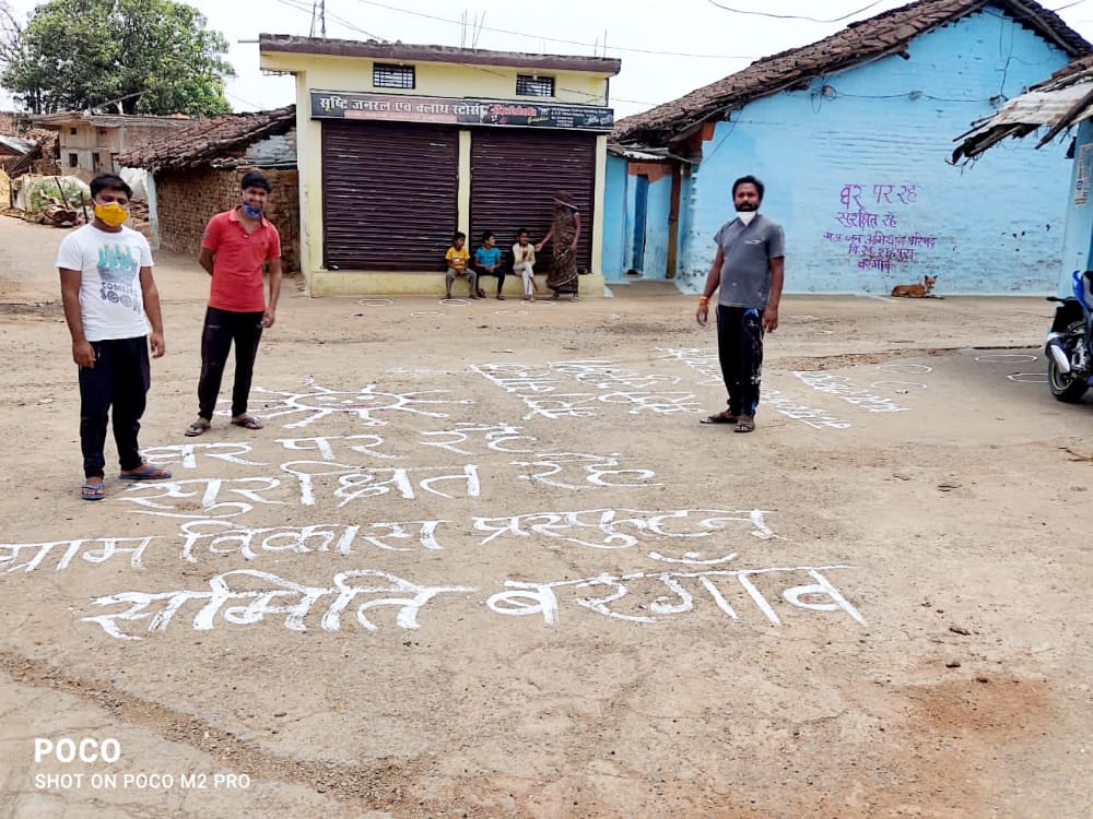 बरगांव-कोरोना के बढते संकमण को देखते हुए चारों तरफ दहशत माहोल बना है ऐसी कठिन परिस्थिति में हम सब को एक साथ मिलकर इससे लड़ना है तभी तो कोरोना से जंग जीत पायेगे ग्राम पंचायत बरगाव मे कोरोना वालेंटियरर्स द्वारा दीवार लेखन कर ग्राम के मुख्य जगह और रोड पर नारे लिखा गया और सोशल डिस्टेंस का कार्य स्वास्थ्य केंद्र दुकानों में गोल सर्कल बनाकर लोगो को कोरोना के प्रति जागरूक करने का कार्य किया जा रहा है जिसमें आशीष साहू , प्रभांशु खंपरिया,विष्णु प्रसाद साहू उपस्थित रहें।