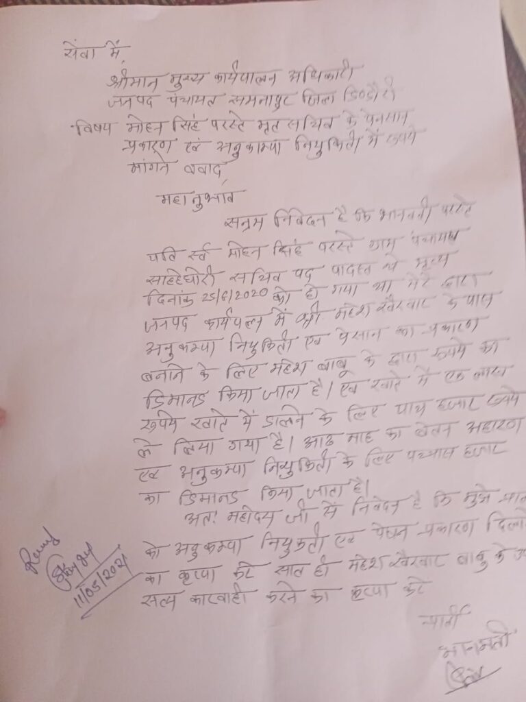 जिले का जनपद पंचायत समनापुर कार्यालय एक बार फिर चर्चा में है, इस बार भी यहां पदस्थ बाबू महेश खैरवार पर एक महिला ने रिश्वत मांगने का आरोप लगाते हुए शिकायत की है। महिला ने लिखित शिकायत में बताया है कि कार्यालय में पदस्थ महेश खैरवार द्वारा साल्हेघोरी में पदस्थ सचिव मोहन सिंह की पत्नी से अनुकम्पा नियुक्ति और पेंशन प्रकरण बनाने के एवज में पचास हजार रुपये की मांग की जा रही है। मृतक का आठ माह का वेतन भुगतान भी शेष बताया जा रहा है।